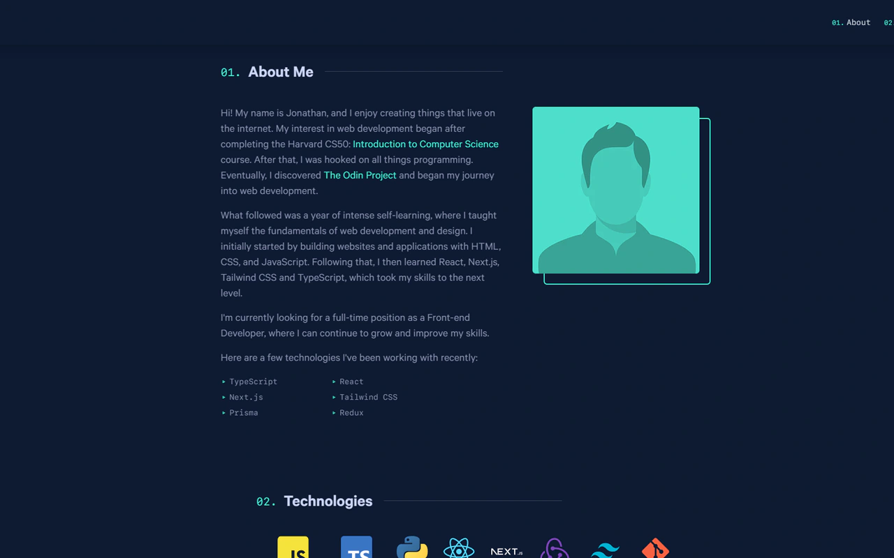 Hi! My name is Jonathan, and I enjoy creating things that live on the internet. My interest in web development began after completing the Harvard CS50: Introduction to Computer Science course. After that, I was hooked on all things programming. Eventually, I discovered The Odin Project and began my journey into web development.